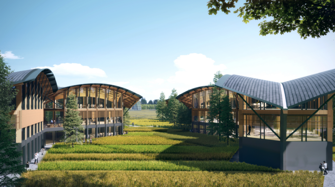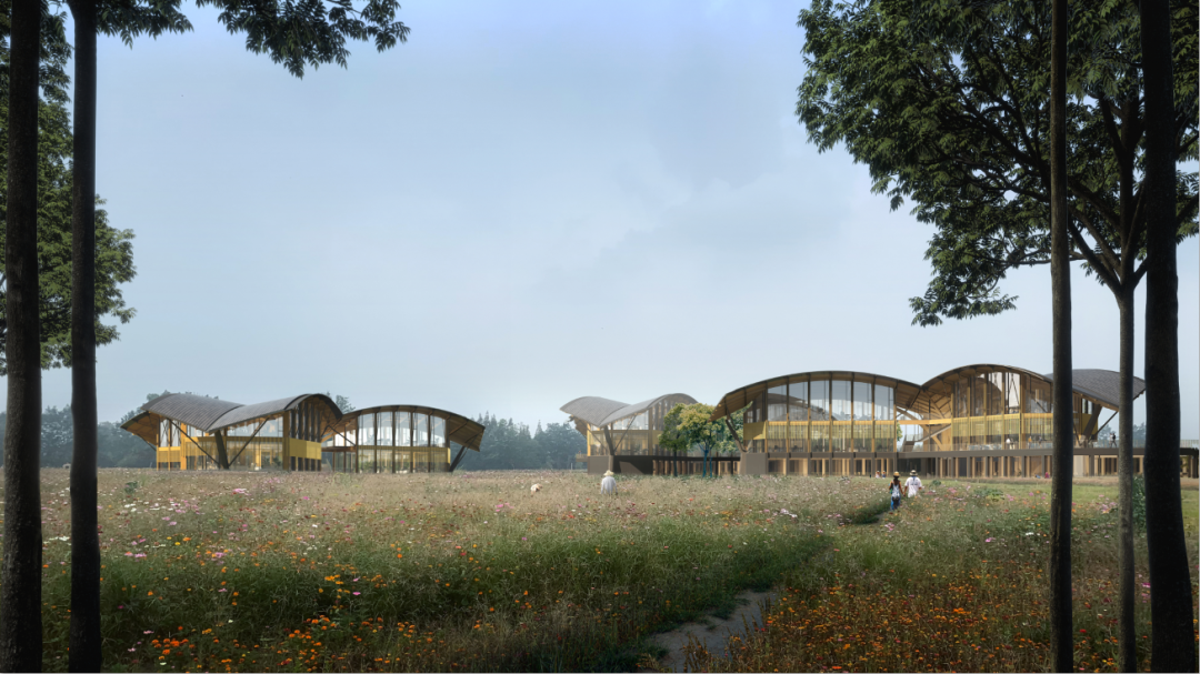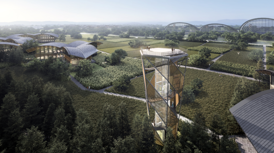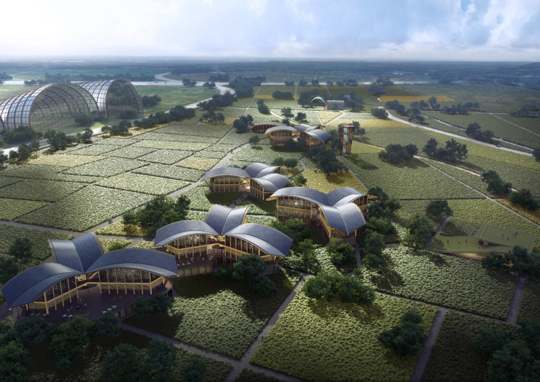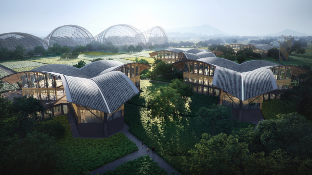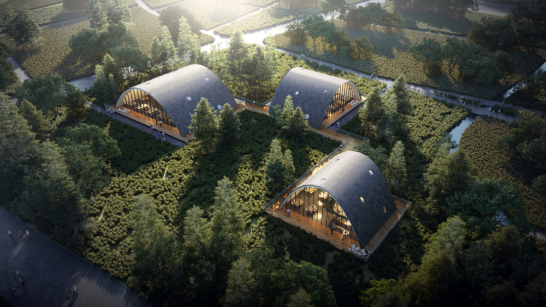農博主展館占地202畝,建筑面積13.2萬m2,按照“田間地頭辦農博”和“功能復合、前展后街”的理念策劃設計。其中,1號館為會議中心,2、3號館為農博展館,4號館為農耕文明博物館,5號館為企業孵化空間,整體呈現“稻浪翻涌”建筑形態。主展館取名“天府農立方”,寓意圍繞“農民、農業、農村三農融合,打造“創新創業創投”三創融合、“文創文博文旅”三文疊加、“生產生活生態”三生互動的新鄉村產業綜合體。