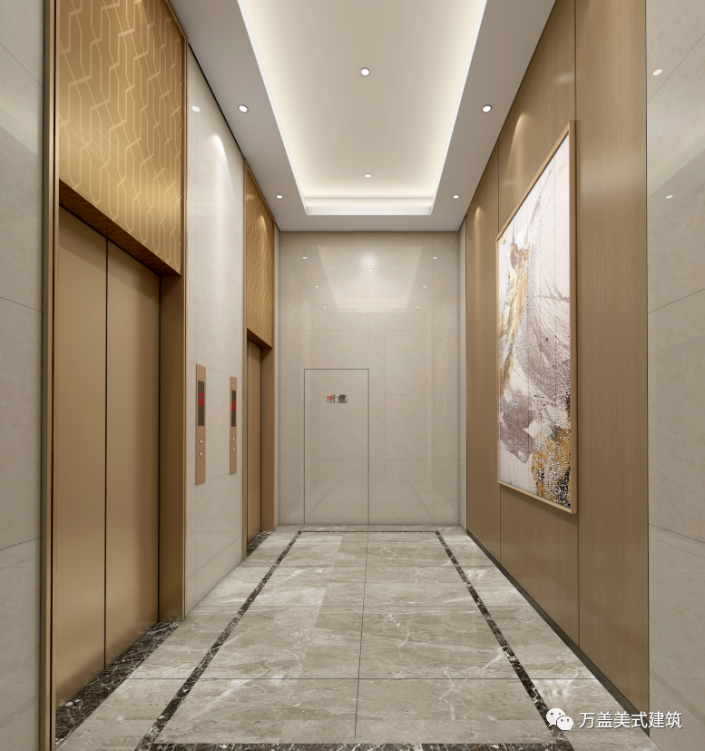 “色”公共空間以暖色為主調,搭配金色作為空間點綴,在營造溫馨、舒適感的同時,塑造出回家的儀式感。“光”首層大堂采用自然采光搭配人工照明,入戶玻璃門將自然光引入到空間中,形成光影交互的視覺效果。