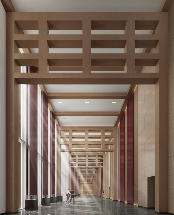 整個邊廊空間具有通高的玻璃幕墻,通透,外敞,與建筑外立面的風格相互延續互補,將建筑形式引入的室內造型中,形成整體的風格形式。