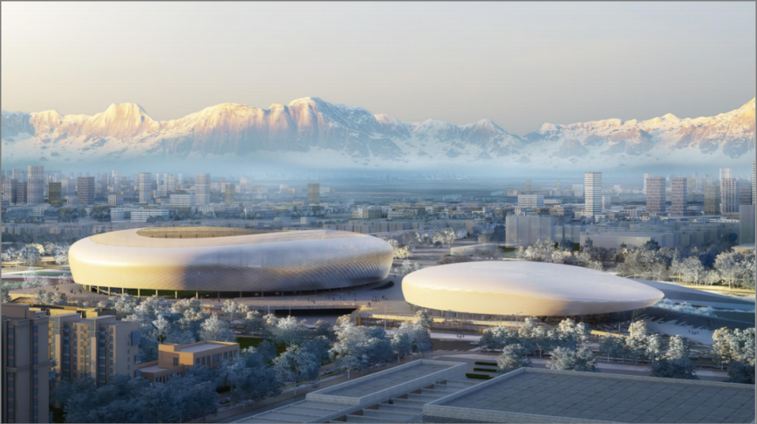 體育場以“藍天高遠,雪山綠洲”立意,展現石河子別樣的壯闊美,呈現兵團從荒涼戈壁建設到蓬勃綠洲的景象,打造活力四射、欣欣向榮的體育空間。