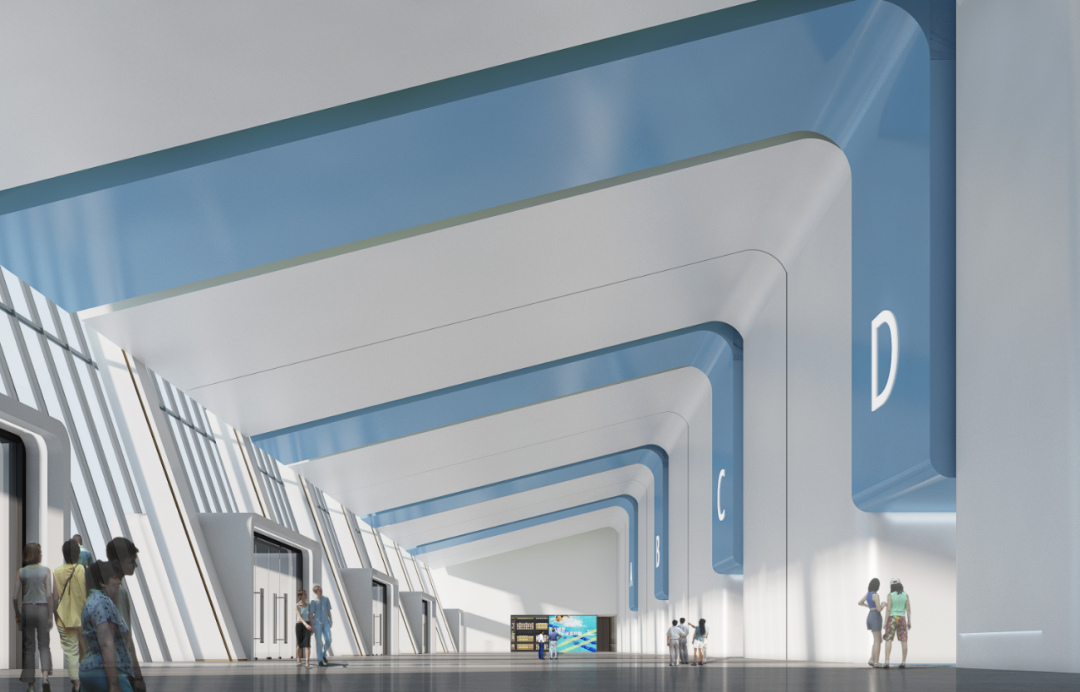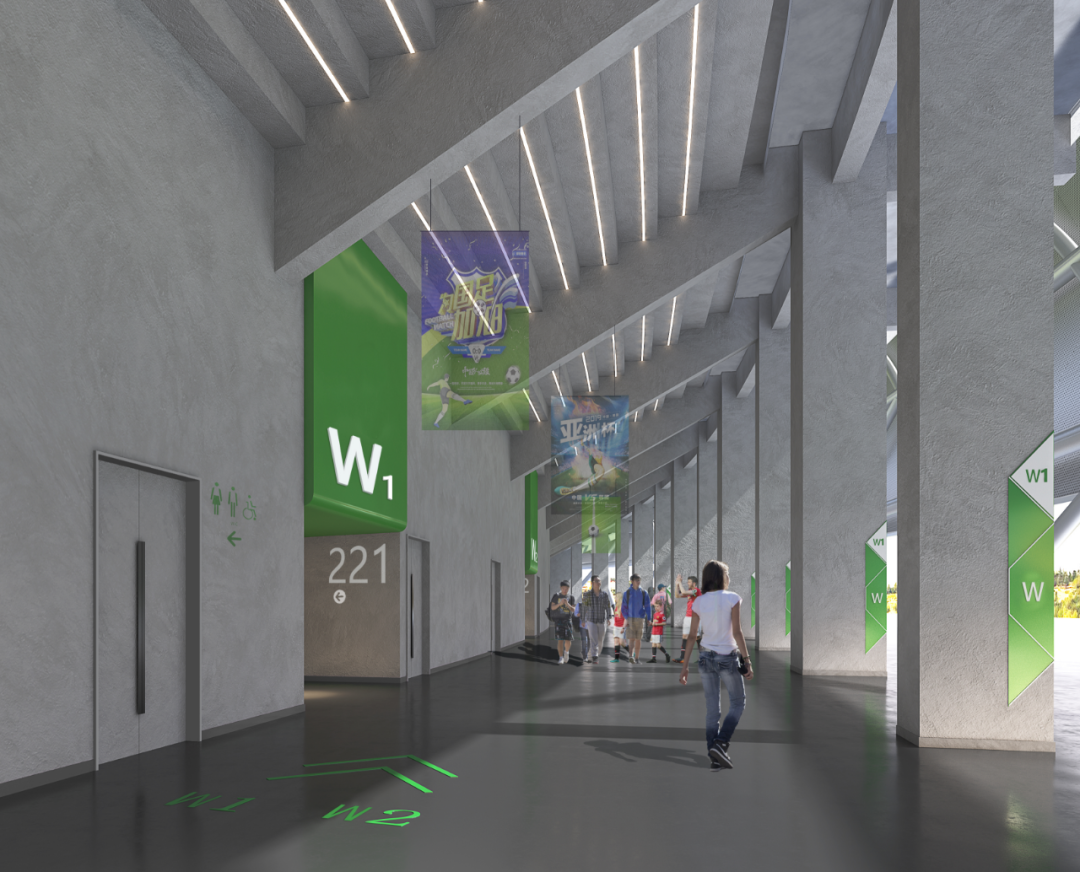 體育場觀眾休息廳以干凈、時尚的灰色為主基調,搭配主題色彩加以點綴,增強空間視覺沖擊力,同時傳達出體育空間生動、活力、向上的氛圍。