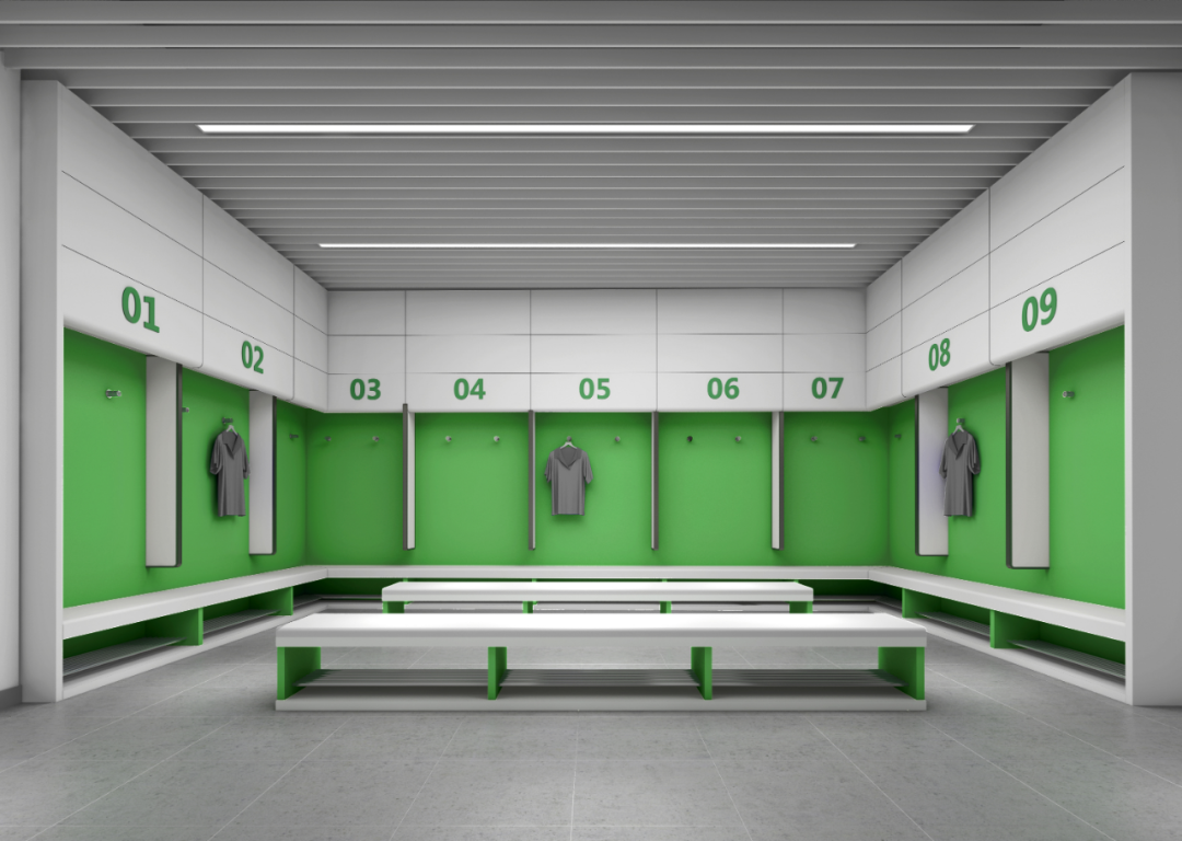 體育場更衣室以簡潔、干凈的造型和色彩為基調,空間頂面采用白色鋁格柵,地面鋪裝仿石材防滑地磚,空間整體簡潔、美觀、易清潔。
