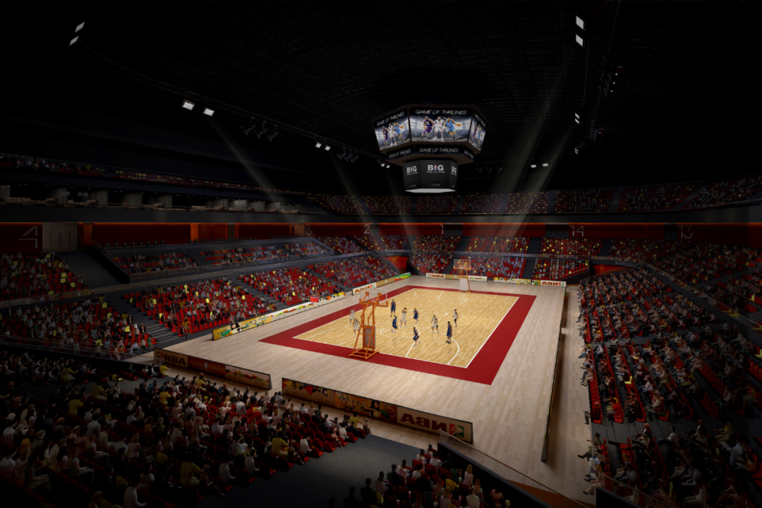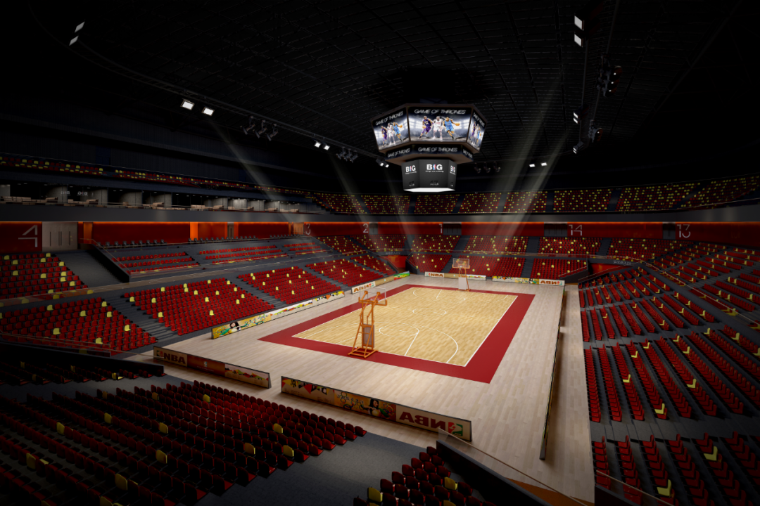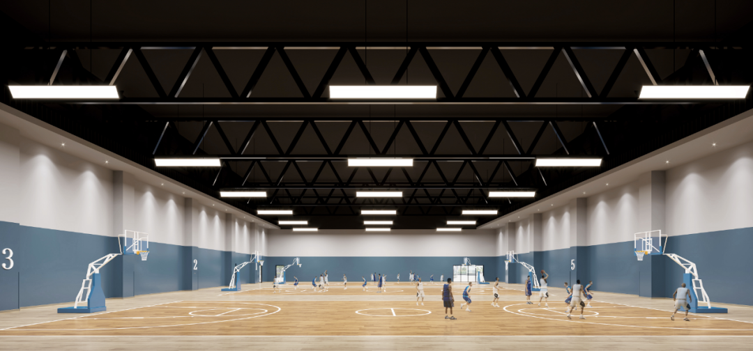 籃球館,以藍色為基調,在設計用材上多選用吸聲、隔音、消聲的材料,對聲音進行降噪優化處理,人們即使在嘈雜的環境中也能清晰對話。