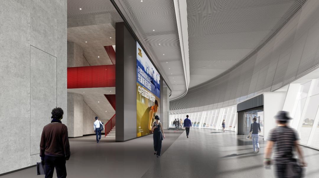 天花用拉伸網結合鋁方通造型打造空間,增加空間質感,形成虛實、序列的韻律空間,空間中場館主題色的點綴增強空間視覺沖擊力,整體空間恢弘大氣、動感十足。