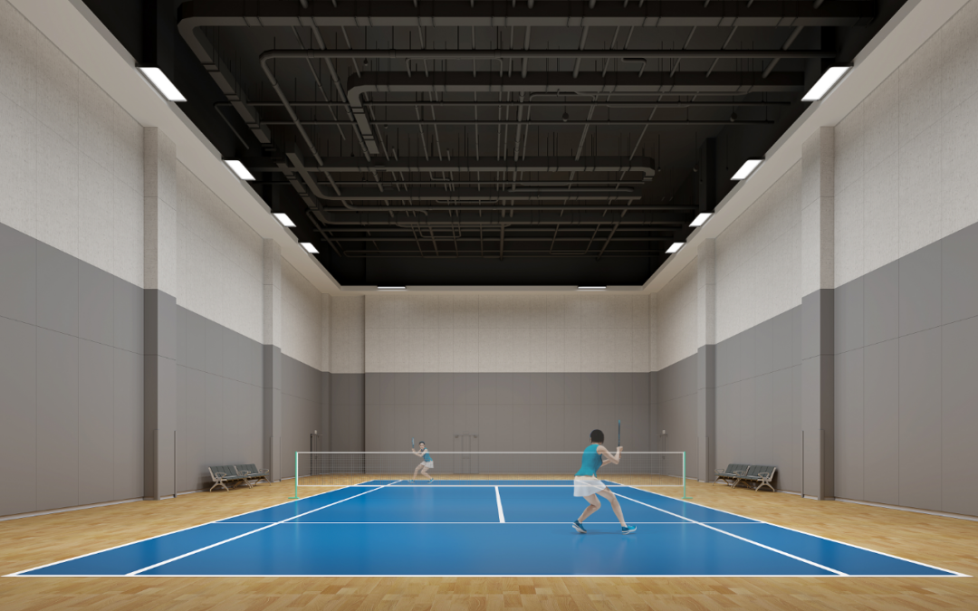 網球館造型簡潔、律動,契合場館特性 。墻壁選用灰色加以白色進行跳色搭配,賦予空間豐富的層次感和舒適的視覺體驗。