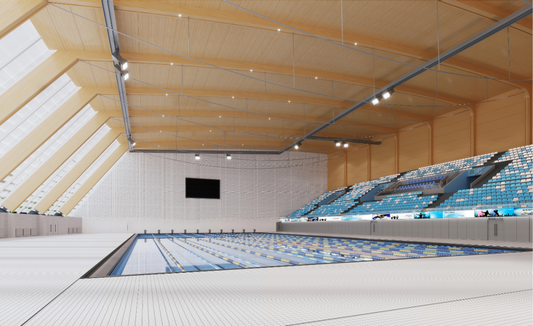 游泳館比賽大廳,運用藍色作為場館主題,清新藍調與泳池里水波搖曳的藍色光影完美融合,將整個空間的輕松氛圍烘托到極致, 靜謐舒適的環境也能幫助運動員更好的調節肌肉、緩解比賽壓力。
