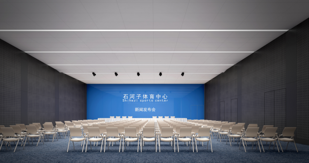 新聞發布廳黑白灰的主基調,突出場館主題藍色的主背景,墻面穿孔吸音板、頂面玻纖板和地面地毯的運用,保證了聲學需求。簡約并具有層次感的造型,簡潔現代富有時尚感。